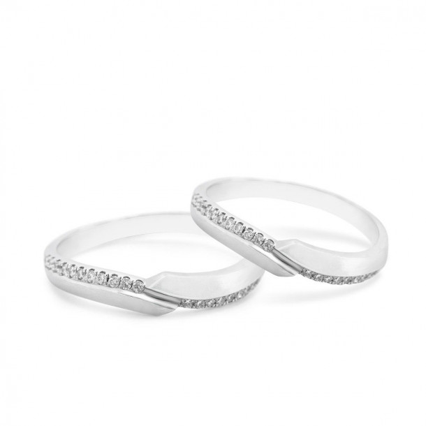 Model ini menghiasi band cincinnya dengan berlian kecil yang ditata rapi. Meskipun batunya mungil, kilauannya menyebar rata dan tetap anggun. Bukan pamer, tapi juga nggak malu-malu.