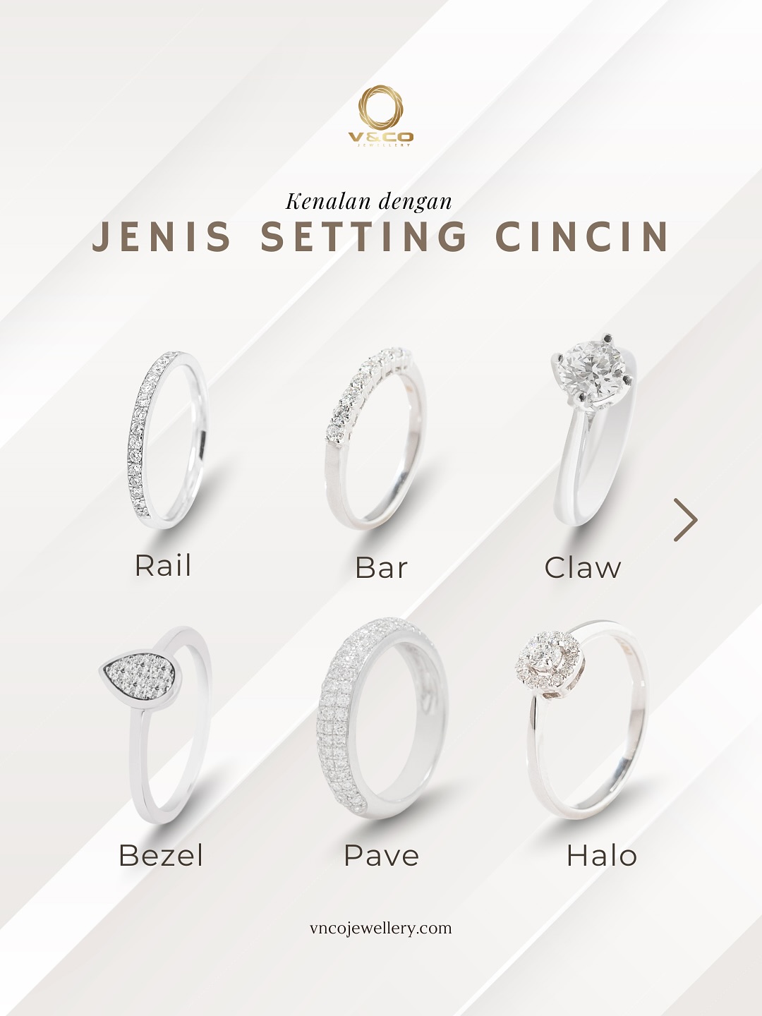 Nah, agar kamu lebih mudah mengenalinya, berikut V&Co akan bahas tentang enam jenis setting cincin yang paling populer: Rail, Bar, Claw, Bezel, Pave, dan Halo. Simak pembahasannya sampai selesai, ya!