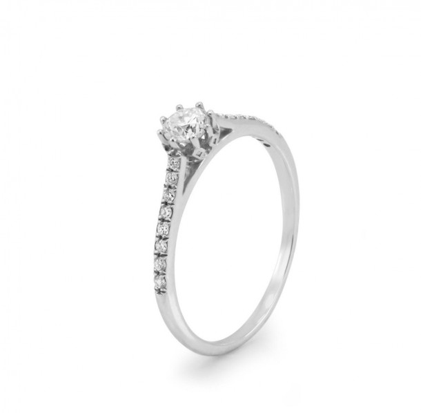 Tampil lebih berkilau merupakan poin utama pada salah satu model cincin tunangan dari koleksi cincin wanita V&Co Jewellery yang satu ini. Model cincin tunangan ini terbuat dari emas putih 18K dan memiliki rancangan sleek yang begitu ramping dalam variasi cincin bentuk glossy and doff yang akan memaksimalkan kilau yang dimilikinya. Demi menjaga kilau yang lebih lamalapisan rhodium diberikan sehingga cincin memiliki sifat anti korosi seperti layaknya platinum dan menjadi lebih kokoh atau kuat. Butiran-butiran berlian yang menaburi model cincin tunangan ini memiliki tingkat kejernihan VVS-Vsberpotongan round diamond dan berada pada grade F. Pada bagian centerterdapat 1 butir berlian sebesar 0,28 karatsementara itu pada bagian sideterdapat 16 butir berlian sebesar 0,11 karat. Bila Anda menginginkan model cincin berlian yang tipis dan modern tetapi juga elegancincin ini bisa menjadi pilihan yang tepat.