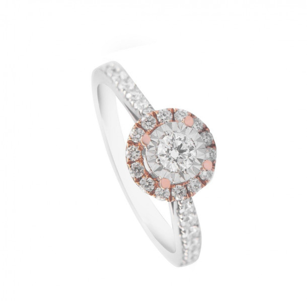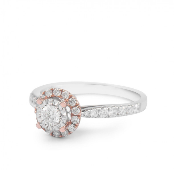 Cincin ini juga dilapisi dengan rhodium yang merupakan salah satu jenis platinum untuk mendapatkan sifat anti korosi dan membuat kilau cincin bertahan lebih lama. Sebagai fokus utama dari cincin iniberlian-berlian berpotongan round diamond dan memiliki tingkat kejernihan VVS-Vs dan berada pada grade Fmenaburi cincin ini. Untuk bagian center atau tengah-tengah cincinterdapat 1 butir berlian sebesar 0,13 karatsedangkan untuk bagian sidenyaada 2 butir berlian sebesar 0,01 karat dan 26 butir berlian sebesar 0,20 karat yang menemaninya. Model cincin tunangan ini cocok bagi Anda yang menyukai tampilan glamour dan elegan.