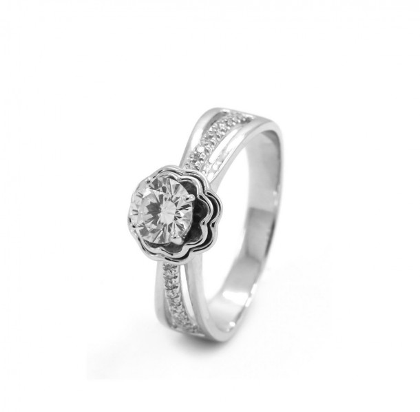 Untuk center diamond yang berada pada tengah cincin yang berbentuk bunga1 butir berlian yang dipergunakan memiliki karat sebesar 0,55 karatsedangkan untuk side diamondsnya sebesar 0,14 karat sebanyak 20 butir yang berada di kedua sisinya atau pada tengah triple lines. Jika Anda menginginkan tampilan cincin tunangan yang berbedacincin ini bisa menjadi pilihan yang tepat.
