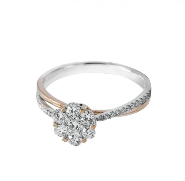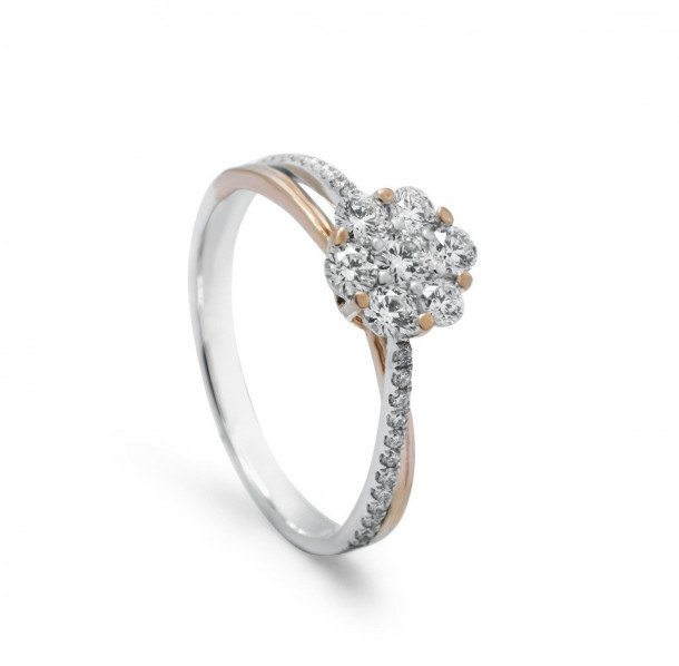 Bagi Anda yang kehabisan ide model cincin tunangan seperti apa yang Anda inginkansalah satu model dari koleksi cincin berlian wanita V&Co Jewellery ini bisa menjadi salah satu inspirasi bagi Anda. Memiliki tampilan yang terlihat lebih besar pada bagian tengahnya yang menyerupai bunga bunga yang bermekaranmodel cincin tunangan ini memiliki berat hanya 2,5 gram saja. Model cincin tunangan ini dirancang dalam bentuk glossy and doff sehingga dapat memaksimalkan kilau dari emas putih. Cincin ini juga dilapisi dengan rhodiumyang merupakan salah satu jenis platinumdimana akan memberikan sifat anti korosi sehingga kilau yang dimiliki dapat bertahan lebih lama. Model lingkarnya yang bersilang dan memiliki warna yang berbeda membuat cincin ini terlihat lebih modern. Pada bagian tengahnya terdapat 7 butir round diamonds sebesar 0,42 karatsedangkan pada bagian sisinya terdapat 24 butir berlian sebesar 0,09 karat. Model cincin tunangan dengan berlian-berlian yang memiliki tingkat kejernihan VVS-Vs dan berada pada grade F ini akan terlihat begitu mewah pada jari Anda.