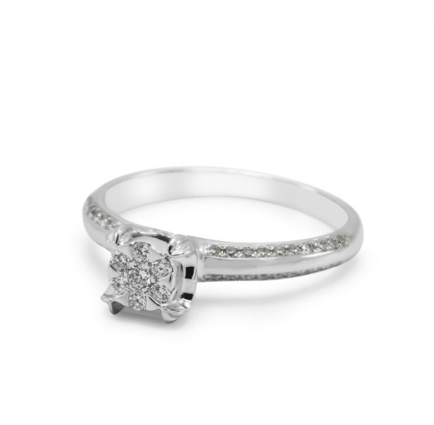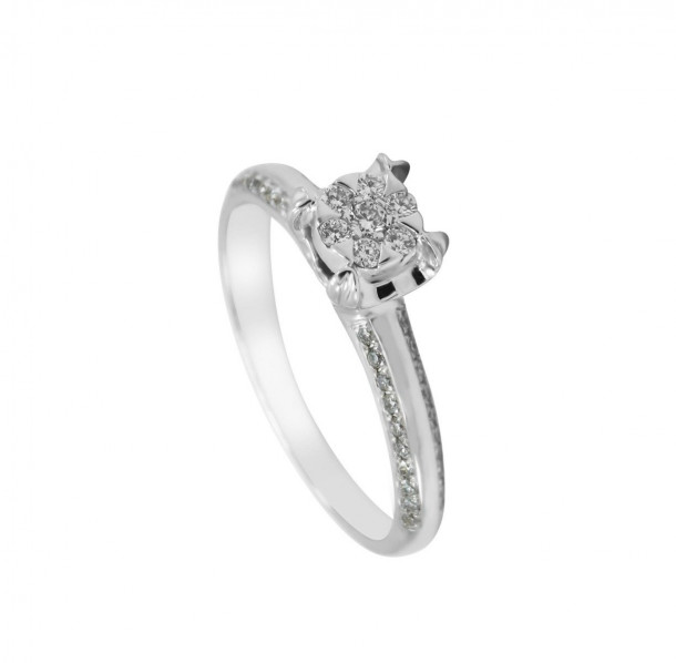 Salah satu model cincin tunangan dari koleksi cincin berlian wanita V&Co Jewellery ini hadir dalam rancangan yang antic dan berkesan long-lasting. Model cincin tunangan ini terbuat dari emas putih 18K yang dilapisi dengan rhodium yang merupakan salah satu jenis platinum dan akan memberikan sifat anti korosi kepada cincin ini. Dengan bantuan rhodium inicincin yang dibentuk dalam variasi glossy and doff akan lebih cemerlang dan memiliki kilau yang dapat bertahan lebih lama. Pada bagian tengah cincin ini terdapat 1 butir berlian sebesar 0,02 karatsedangkan pada bagian sampingnya terdapat 49 butir berlian sebesar 0,19 karat. Berlian-berlian ini memiliki jenis potongan round diamond dan berada pada grade F dimana tingkat kejernihannya adalah VVS-Vs. Jika Anda menginginkan model cincin tunangan dengan desain yang klasik dan rumit dimana bagian tengah atau focus utamanya tidak memiliki garis-garis yang jelasmodel cincin yang satu ini bias menjadi bahan pertimbangan terbaik bagi Anda.