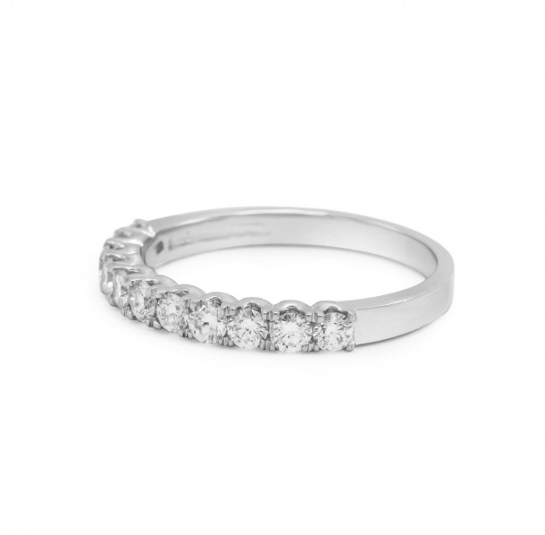 Model cincin tunangan ini merupakan salah satu dari koleksi V&Co Jewellery yang memiliki rancangan yang sangat sederhana dimana setengah polos dan setengah lagi diberikan taburan berlian-berlian dengan tingkat kejernihan VVS-Vs dan berada pada grade F. Didesain dengan memikirkan keinginan Anda sebagai penggunacincin tunangan ini memiliki model yang elegan dalam variasi cincin emas putih glossy and doff yang begitu berkilau. Tidak hanya itucincin tunangan ini dilapisi dengan rhodium sehingga anti korosi terhadap senyawa-senyawa tertentu. Berlian-berlian yang berada di tengah cincin tunangan ini memiliki potongan round diamond yang akan merefleksikan cahaya dengan lebih baik. Tidak satu atau duamelainkan ada 11 butir berlian sebesar 0,45 karat yang akan membuat cincin tunangan ini terlihat begitu mewah pada jari Anda.