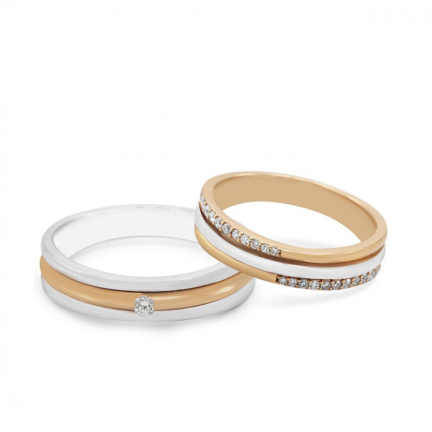 Untuk memaksimalkan sisi keindahan dari rancangannya, model cincin kawin pria memiliki 1 butir center diamond sebesar 0,03 karat tanpa side diamond, sedangkan untuk model cincin kawin wanitanya memiliki 22 butir side diamond sebesar 0,15 karat tanpa center diamond. Desain cincin kawin yang satu ini cocok bagi Anda dan pasangan Anda yang ingin tampil stylish di hari besar Anda nanti.