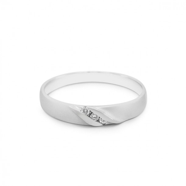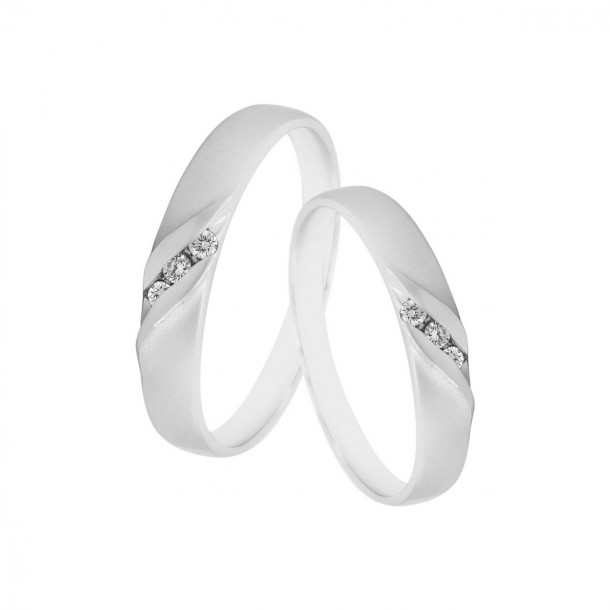 Hal ini disempurnakan dengan bentuk variasi cincin kawin yang glossy dan doff sehingga memiliki kilau yang sempurna dari emas putih. Bukan 1 butir batu berlian yang menjadi center focus keindahan cincin kawin ini, melainkan 3 butir berlian sebesar 0,06 karat. Berlian berbentuk round diamond yang dipergunakan oleh V&Co Jewellery pada model cincin kawin ini memiliki kualitas tinggi dimana tingkat kejernihannya Vvs, yaitu nyaris sempurna, dan berada pada grade F.