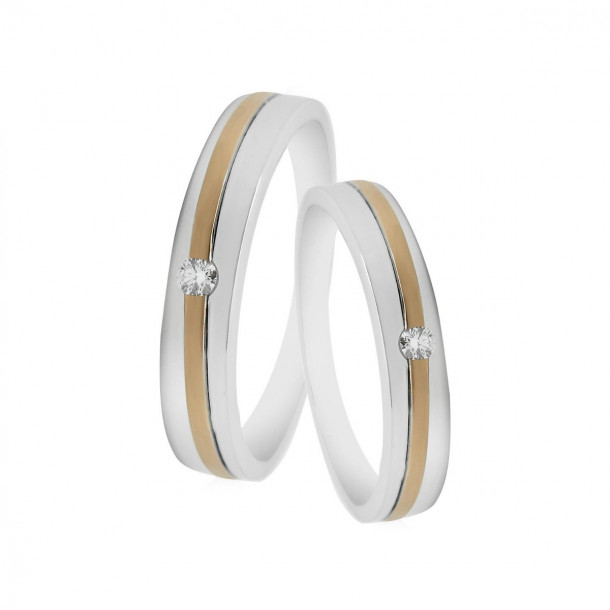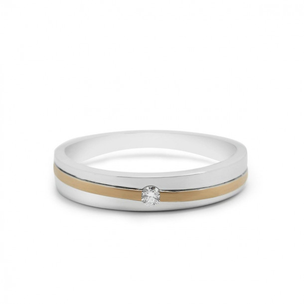 Dibuat dalam bentuk yang klasik, model cincin kawin V&Co Jewellery ini bisa menjadi pilihan terbaik bagi Anda. Cincin kawin ini didesain dalam sentuhan glossyâ€â€yang akan membuat cincin lebih berkilauâ€â€dan doffâ€â€memberikan gradasi efek berpasir atau kasar yang menarik. Jika mencermati bentuk cincin kawin ini, Anda pasti akan tertarik dengan bentuknya yang unik, seakan-akan seperti sebuah cincin emas putih bulat yang super polos dengan sentuhan emas kuning berbentuk sabuk dan bermatakan berlian. Seperti halnya kebanyakan pada koleksi model cincin kawin simple V&Co Jewellery, cincin ini menyertakan batu berlian 0,05 karat dengan clarify Vvs dan potongan round diamond yang indah. Berada pada grade F membuat berlian pada cincin ini dapat memantulkan cahaya dengan sangat baik..